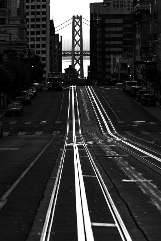 The colorful “Abstract City V,” shown above, is one example from John’s new series titled “Abstract City,” where San Francisco’s many textures come to life. Another from this series and shown below, “Abstract City III,” is a dramatic black-and-white photo of San Francisco cable tracks leading the viewer’s eyes directly to the iconic Golden Gate Bridge.