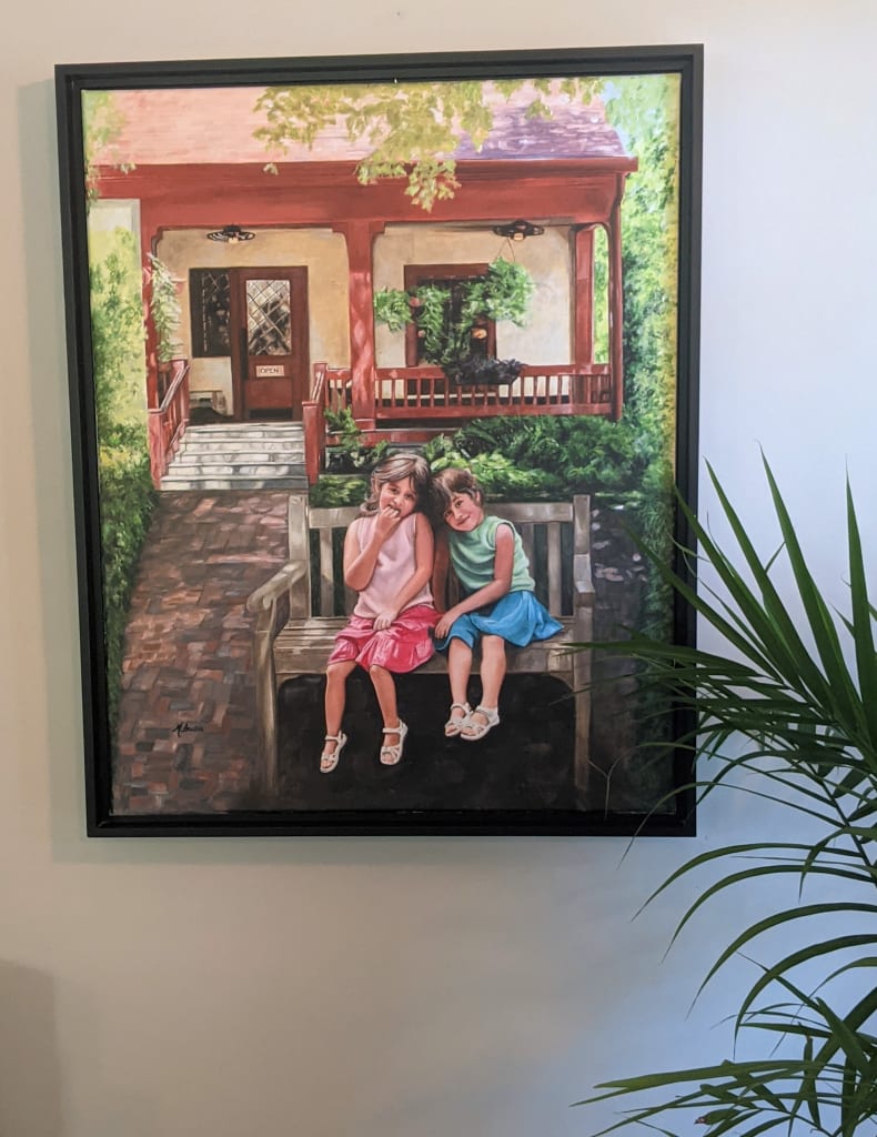In both her portrait and fine art work, Maureen masterfully applies what she learned from her father. We can especially appreciate the way she blends realism with whimsy in her “Brooke in Pieces” oil painting featured above. Maureen is a fan of our Canvas Floater Frame F131 Black, which she used to frame “Corner Kitchen,” also an oil painting, featured below. “I use [the floater frames] for my personal framing and for my client commissions,” Maureen tells us. “They are always beautiful, carefully wrapped, and make my art look professional and finished.”