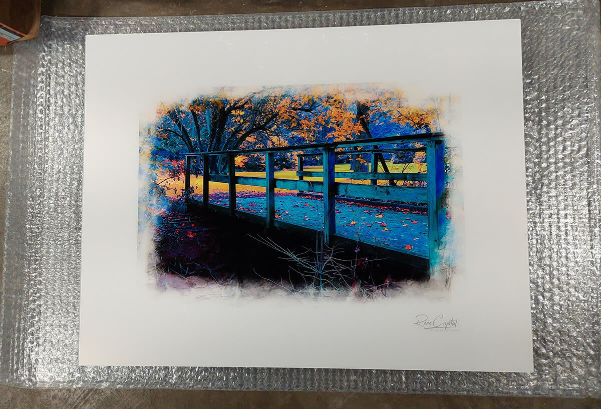 When you’re as prolific as Rene, you need a system for protecting your art. “I use Frame Destination’s Gallery Pouches™ to store and transport all my work,” Rene says. “They have proven to be indispensable.” Her “Bridge to a New Season,” shown below, is resting atop the Gallery Pouch she stores it in. Rene took this photo at a park near her home in Wynnewood, Pennsylvania. In post, she layered and masked out different areas to create the image. “It’s sometimes time-consuming, but always a surprise in the end product,” Rene says.