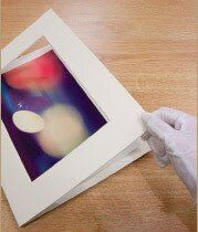 The surface of pigment inkjet prints, or dye inkjet that used pigment for the black ink, can be extremely sensitive to abrasion. For this reason only smooth plastic films, such as polyester sheeting, should be used in contact with print surfaces. The optimal approach is not to allow any material to contact the print's surface. This can be achieved by using window mats to keep the objects separated while stacked. This may not be possible for extremely large prints, in which case smooth plastic interleaving and extreme care should be used.