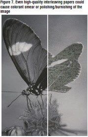 Pigment inkjet prints, especially on soft, fine ar t papers, can be extremely sensitive to abrasion and scratching. Prints should not be piled directly on top of each other. Interleaving should be done using very smooth materials such as polyester sheeting. Even high-quality interleaving papers can cause colorant smear or polishing/burnishing of the image. Prints should not be rolled, as this stresses the image receiver layer and puts the print's inked surface in direct contact with the paper's verso which can result in abrasion damage. Additionally, prints should always be allowed to fully dry post-printing before handling or interleaving to prevent spotting, ferrotyping, or blocking.