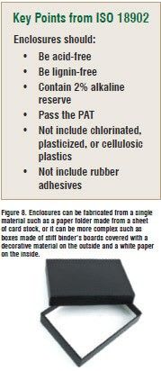 It is more difficult to select safe enclosures for inkjet because of the diversity of ink and paper formulations used as well as their individual chemical and physical responses to enclosure materials. The ISO Standard is not completely satisfactory for inkjet prints due to some unique issues associated with certain damage types including adhesive-induced yellowing and bleed as well as abrasion.