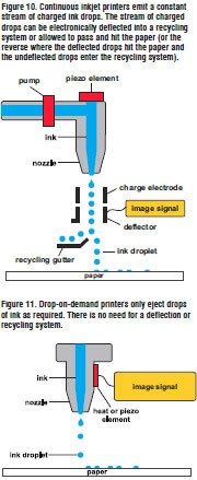 All inkjet printers use drops of ink emitted from nozzles to create colored dot patterns on paper or other printing substrates. There are two main types of inkjet printers - continuous and drop-on-demand. Continuous inkjet printers were the first to be used for high-end, fine-art inkjet images. The technology's original purpose was for creating proofs in commercial printing facilities. Continuous inkjet printers emit a constant stream of charged ink droplets. The drops are either electronically deflected into a recycling system or allowed to pass and strike paper that is attached to a rotating cylinder. A variety of papers can be used as long as they are flexible enough to fit around the printing drum.