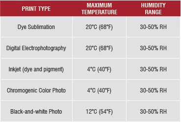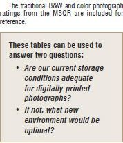 The recommended maximum storage temperatures and relative humidity ranges for each digital print process, based on IPI's data from the DP3 Project, are shown in Table 2. Recommendations from the IPI Media Storage Quick Reference (MSQR) for traditional blackand- white and color photographs are provided for comparison. Note that the recommendations for inkjet supersede those of the MSQR which was published before the extensive digital print preservation research at IPI.