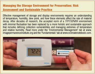 A variety of harmful forces can affect collection objects in storage resulting in multiple decay manifestations. For digital prints the primary drivers of deterioration are heat, moisture, and air pollutants, though each print type has its own unique sensitivities. Signs of decay include image fade, paper yellowing, ink bleed, and cracking or delamination of paper layers. Table 1 shows the types of damage that can result from each environmental factor. Control of temperature, humidity, and air quality can significantly extend the lives of these materials.