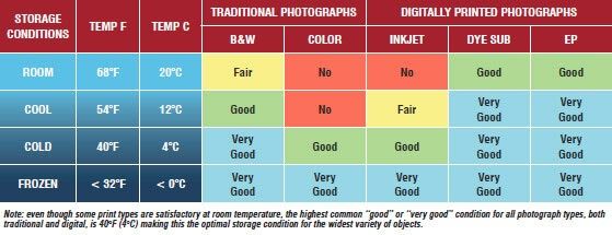 Since few institutions can provide special storage areas solely for digitally-printed photographs, these objects will need to be integrated with other collection materials. Fortunately, the basics of traditional photograph care can, with a few exceptions, be applied to digitally-printed photographs. IPI's MSQR provides information on thoughtfully merging multiple traditional media collection types into four or fewer common storage conditions. Table 3 provides qualitative ratings for each material at each storage condition and Table 4 defines the rating system. The temperatures in Table 3 correspond to general storage categories from the IPI MSQR.